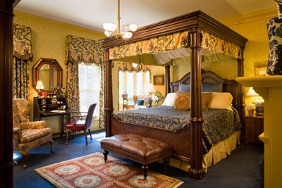 Fireplace and wrap-around balconies on the 2nd and 3rd floors Turret Room This spacious room is the most popular in the house. It has a king-sized four poster canopy bed, private bath (with a 2-person whirlpool tub), and a flat-screen television with cable and a DVD/VCR.