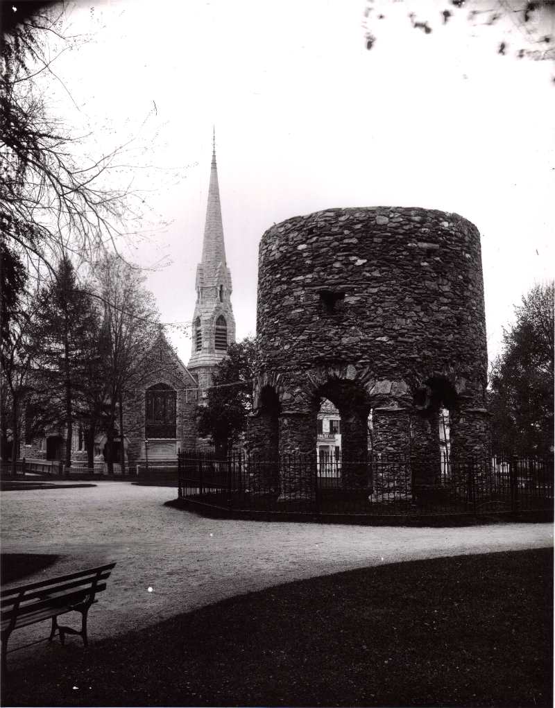 This shot was taken in Touro Park. Newport Tower is in the foreground and Channing Memorial Church is in the background.