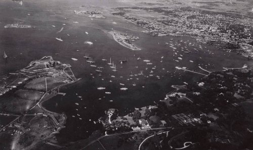 This is an aerial shot of Newport Harbor. Fort Adams is on the left, Goat Island is in the center of the harbor and downtown Newport is on the right.