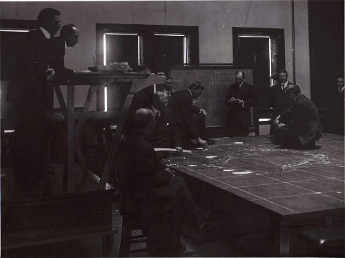 This shot was taken in 1913 at the U.S. Naval War College game room. All I can make out on the chalk board are the words: Red, Blue and a bunch of times.